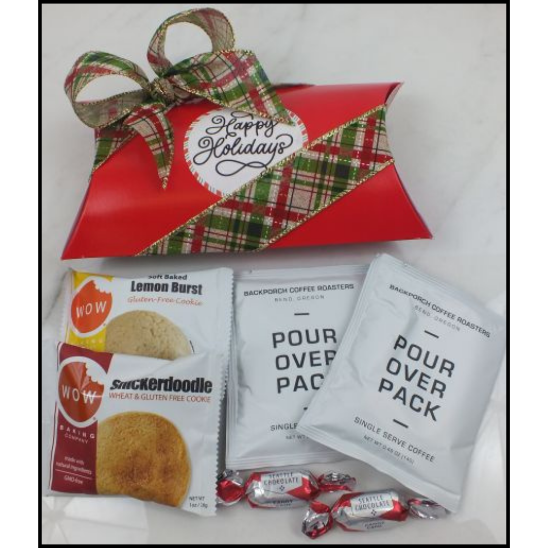 Designed in a red pillow pack with holiday ribbon. This gift can be personalized with your logo instead of our standard holiday label.