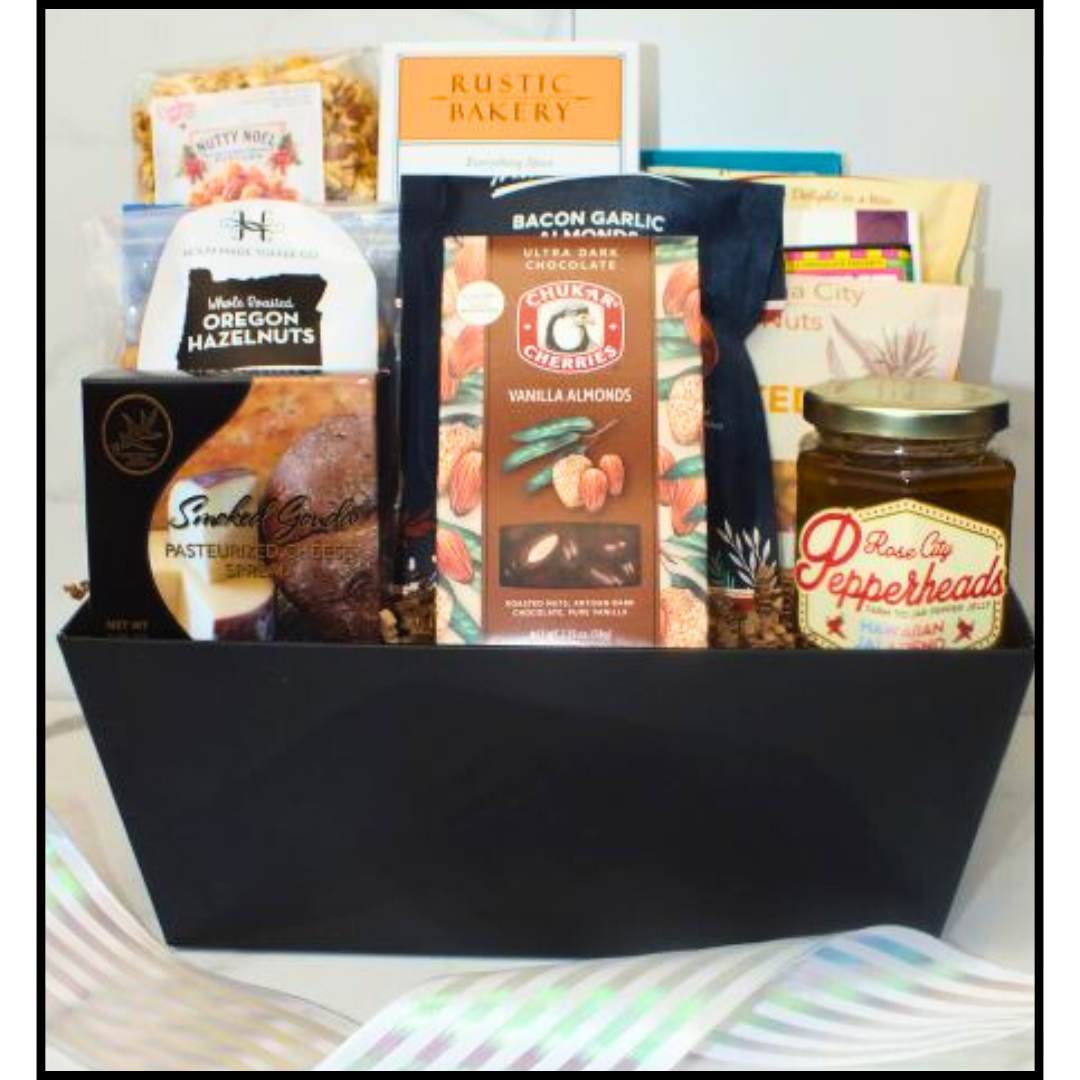 Designed in a modern themed container. Wrapped in Cellophane with handmade bow.